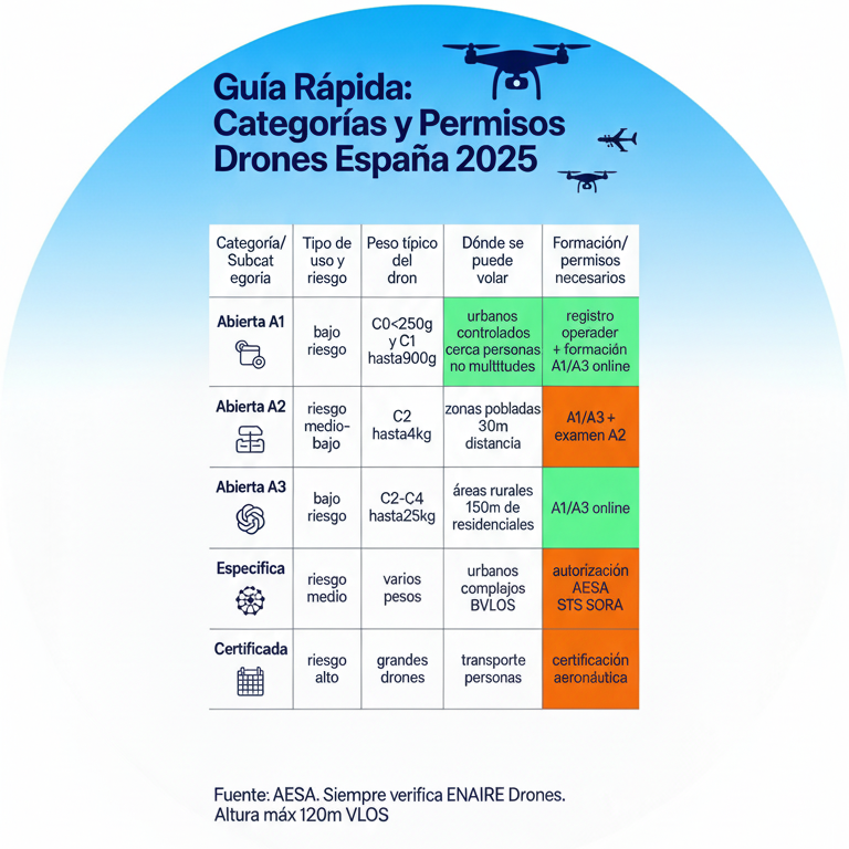 Con el certificado, accede a las subcategorías A1 (sobre personas no involucradas con drones C0/C1) y A3 (hasta 25kg en zonas alejadas de ciudades), usando equipos C1-C4 que cubren el 90% de vuelos recreativos y pro. Sin ella, te limitas a drones básicos, perdiendo opciones en España y la UE.